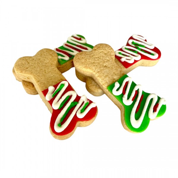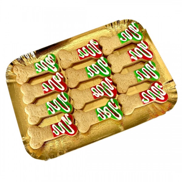 EN Dolci Impronte Tray 12 Christmas Bones Red and Green 276g – Vacuum-sealed tray containing 12 bone-shaped decorated biscuits (8 cm), carefully hand-decorated one by one in our artisan workshop – Tray size: 28x20 cm – Best before 9 months from production lot date – Once opened, keep away from direct light and heat sources – No refrigeration needed – Complementary feed for adult dogs – Characteristics: decorated biscuit – Composition: cereal flour (soft wheat), fructose, pasteurized eggs, vegetable margarine, sucrose, glucose syrup, honey, vegetable oils and fats, corn starch, mono- and diglycerides of fatty acids, glycerin – Technological additives: preservatives (sorbic acid 1a200, potassium sorbate 1k202, citric acid 1a330), emulsifiers, antioxidants – Organoleptic additives: flavouring – Analytical constituents: crude protein 8%, crude fibre 1.9%, crude fat 11%, crude ash 0.56%, moisture 14% – Directions for use: serve with fresh water available, up to 10% of daily food intake – The dosage is indicative and should be adjusted based on activity, age, breed, individual condition and climate – Produced for Fifty S.r.l., Venezia 30124, San Marco 5278, info@dolcimpronte.it, at facility IT900011VE.
