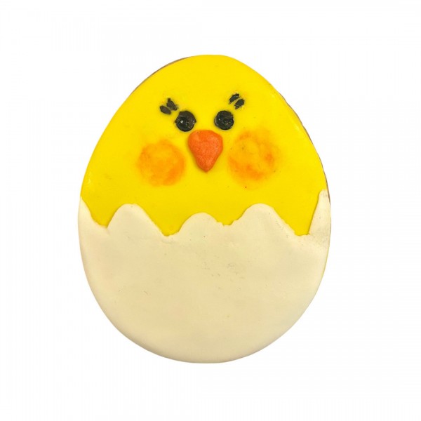 Hand-decorated shortcrust pastry biscuit, 8x7 cm, featuring a hatching chick. Delivered in a food-safe bag adorned with a Dolci Impronte ribbon. Complementary feed for adult dogs. Characteristics: hand-decorated shortcrust pastry biscuit. Composition: flour (soft wheat), fructose, pasteurized eggs, vegetable margarine, sucrose, glucose syrup, honey, vegetable oils and fats, mono- and diglycerides of fatty acids, glycerol. Technological additives: preservatives (potassium sorbate 1k202, sorbic acid 1a200, citric acid 1a330), emulsifiers, antioxidants. Organoleptic additives: flavoring. Analytical composition: crude protein 8%, crude fiber 1.9%, crude fat 11%, crude ash 0.56%. Net weight: 64g. Directions for use: serve up to 10% of the total daily ration, the dose is indicative and should be adjusted based on physical activity, age, breed, individual physical condition, and climate conditions. Ensure fresh water is available. Once opened, store the product in a cool, dry place. Produced for Fifty S.r.l., Venice 30124, San Marco 5278, e-mail: info@dolcimpronte.it at the IT900011VE facility.