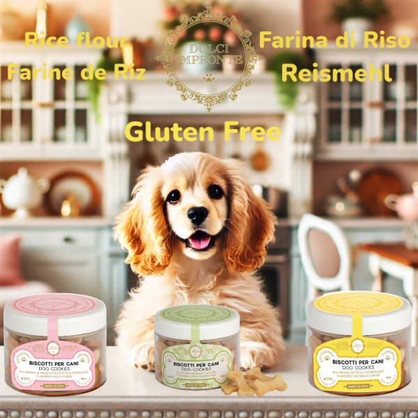 FR: Dolci Impronte - Biscuits à la Farine de Riz - Aromatisés Jambon et Fromage - Bocal 170g Biscuits en forme d’os, fabriqués à la main un par un avec de la farine de riz et aromatisés. Conditionnement : bocal Caractéristique : biscuit en pâte sablée Sans Gluten. Composition : farine de riz, fructose, œufs pasteurisés, margarine végétale, miel....