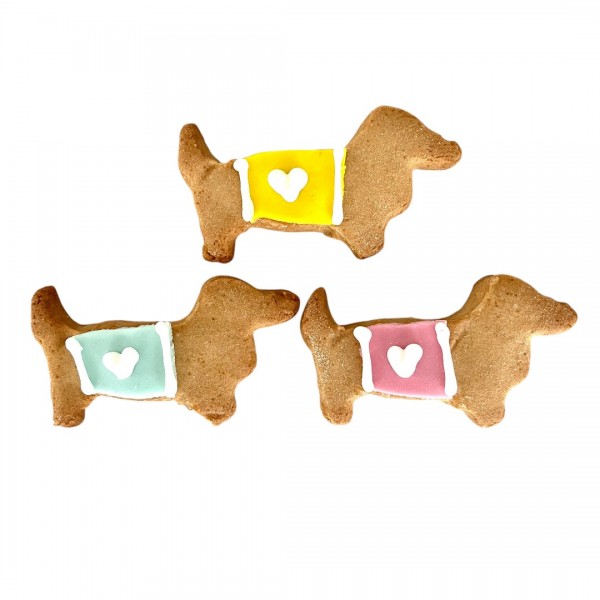 Tray containing 12 crumbly biscuits, dachshund-shaped, handmade and finely decorated.