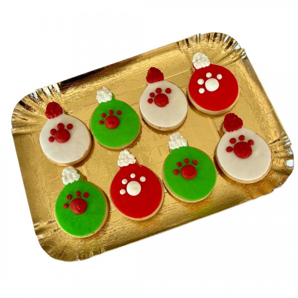 Vassoio sottovuoto contenente 8 biscotti decorati a forma di pallina di natale, verde o rossa, 8cm, finemente decorata a mano uno ad uno nel nostro laboratorio artigiano. Misure vassoio: 28cm x20cm.