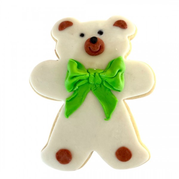 Sacchetto cristal con nastro rosso personalizzato Dolci Impronte, contenente un simpatico orso bianco natalizio (10cm), realizzato e decorato completamente a mano in laboratoro artigianale.