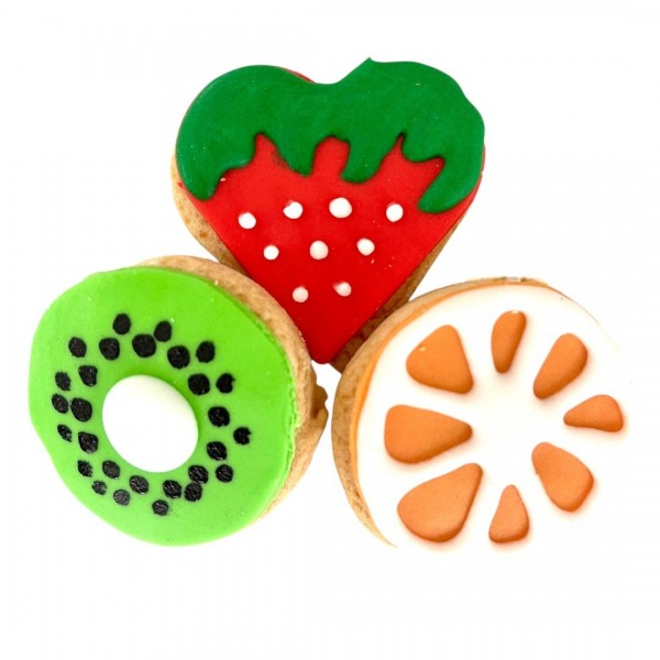 Vassoio contenente 15 biscotti friabili, a forma di frutta, fatti a mano e finemente decorati.